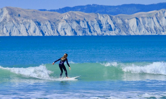 Upon arriving in Gisborne, my husband Matt, easily the most excitable person I know, visits a surf shop in town and buys a couple of boards. We don’t even have our bank account here setup yet, but we’ve got boards and wetsuits! (The water here is freezing). I’m glad we have our priorities straight. He learns from locals where the best beginning surf spots are and before fully recovering from jet lag, Matt has managed to get us all zipped up in rubber and out to the water’s edge. We’ve watched multiple surf instructive videos on YouTube, so we’re pretty confident we can just give it go. (Cough…ahem…yeah).
